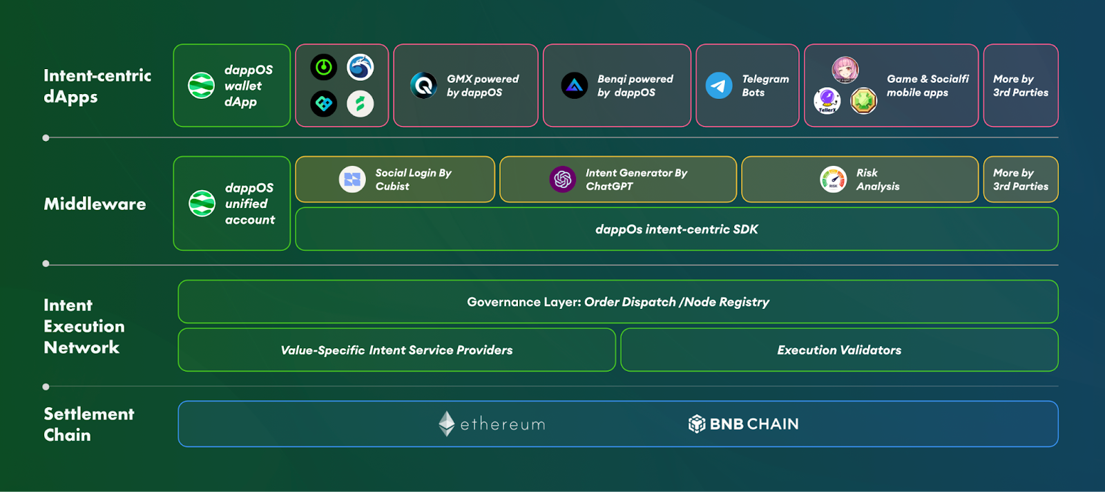 与此同时 dappOS 还提供了与该网络兼容的中间件,开发者能够低成本的将这套“意图”能力向更多 dApps 拓展,并保持去中心化特性。因此,dappOS 正在推动所集成 dApps 到“去中心化意图应用”的凡是转变。