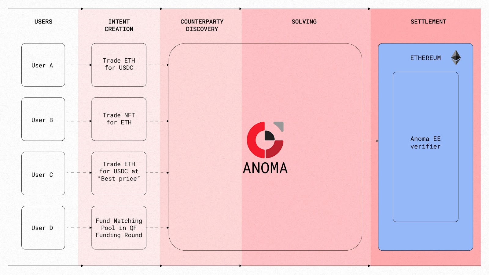 Anoma 协议是最早引入“意图”概念的协议,提供了以意图为中心的通用 dApp 架构。该架构旨在满足广泛的请求,使提供服务的 dApp 能够将意图与求解器网络保持一致,促进用户意图与跨各种应用程序和场景的求解器的匹配。值得一提的是,Anoma 实际上是一个“接口”,是一系列可以被自由复制的代码,而不是一条中介链,因此不会有 Anoma 链。也就是说,Anoma 可以被部署到当前的任何 L1、L1.5、L2 或非 EVM 链,例如以太坊主网、Arbitrum、Solana、Cosmos、Eigenlayer AVS。