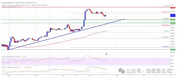 比特币目前交易价格高于 70,000 美元和100 小时简单移动平均线。BTC/USD 货币对的小时图上还形成了一条关键的看涨趋势线,支撑位在 70,750 美元附近。趋势线接近从 68,954 美元波动低点到 72,609 美元高点的上行波浪的 50% Fib 回撤位。