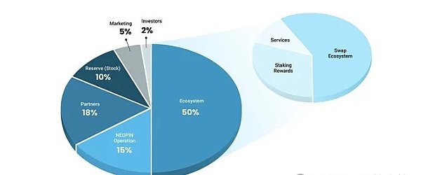 NEOPIN 的生态代币 $NPT 发行总量为 10 亿枚,目前流通供应链约 8,664 万枚,流通率低于 10%。$NPT 的分配比例如下: