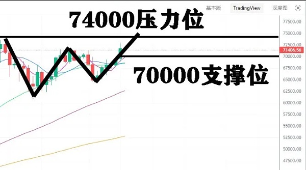 从比特币的日线走势来看,有望形成W底走势,随后必将冲击74000美元,很可能会再次创下历史新高。短期内,随着MACD形成零上二次金叉,势头强劲,新一轮上涨行情即将展开。如果本周价格能回调至70000美元附近甚至更低,可以考虑分批加仓现货,抓住再次创新高前的最后机会。