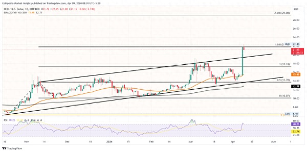 对于上行入场点,根据基于趋势的斐波那契水平,22美元的突破是可行的。这一突破可能会推动山寨币本周上涨至30美元大关。