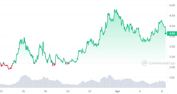过去 24 小时内,dogwifhat 的交易量飙升至 662,468,564 美元,表明投资者的兴趣不断增长。 Dogwifhat 目前的市值为 41.1 亿美元,已成为第三大模因币。该模因币的价格目前高于前一天的开盘价,表明交易者的看涨情绪。这种乐观情绪是在 WIF 突破下降楔形形态之后出现的。