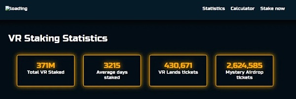 VR 的持有者还可以通过质押获得更多奖励,质押VR通证在每个月都有可能获得具备不同品质的神秘宝箱,以兑换游戏上线后各个种类的道具。随着质押数量越多、时间越长,用户获得游戏收入分享、游戏土地 NFT 白名单、VR 通证质押本身的 APY 的比例就越高。目前有3.71亿的 VR 已经被质押,平均质押时长 3215 天,分发 VR Lands 门票43万余张,魔法空杸门票 262万+