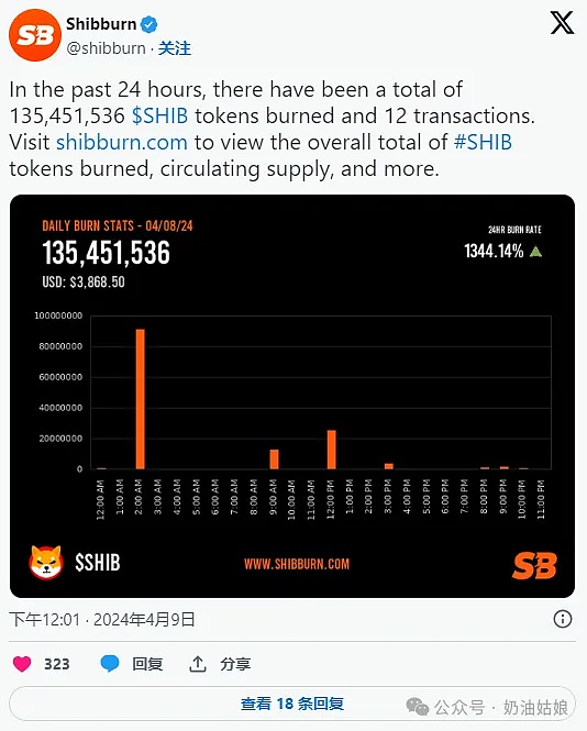 对于 SHIB 投资者来说,代币销毁活动的激增正值关键时刻,因为有迹象表明加密货币的价格动态可能发生变化。报告显示,在过去 24 小时内,12 笔交易中烧毁了 135,451,536 个 SHIB 代币,价值达 3,868.50 美元。SHIB 销毁率的激增尤其值得注意,因为其大幅上涨了 1,344.14%。