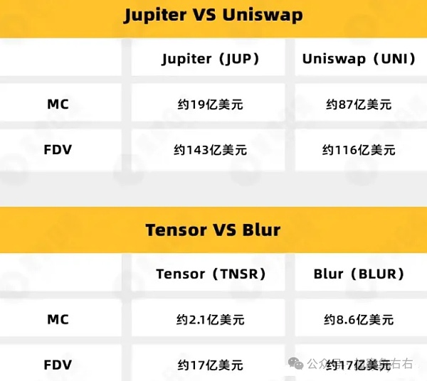 其中,LSD 赛道的 Jito(JTO)以及 DeFi 赛道的 Jupiter(JUP)虽在流淌市值(MC)方面仍较以太坊生态内龙头项目有一定差距,但全流通估值 FDV 却都已实现了超越。具体对比如下: