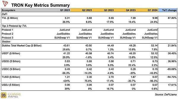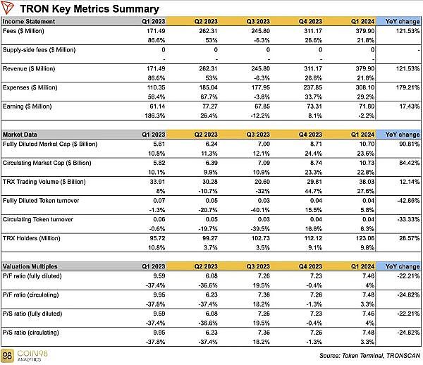 Coin98 Analytics:波场TRON2024年第一季度费用和收入同比增长121.5%