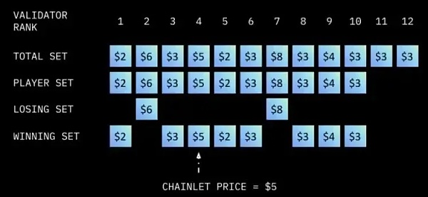 接下来,进入竞价环节的 10 个验证者进行报价,按照报价从低到高排序。选择其中的 8 个作为委托验证者,并以报价最高者的价格作为定价基准。例如,如果报价为 6 美元和 8 美元的第 2 号和第 7 号验证者被淘汰,那么剩下的 8 个验证者同意以 5 美元的价格进行。