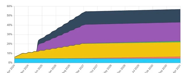 截至2024年4月4日,$SAGA的初始供应量为10亿枚。在初始代币发行(TGE)时,总流通量约为9000万枚,占代币初始总供应量的9%。