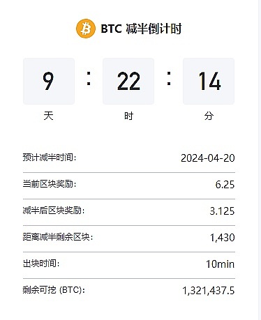 比特币还有九天就减半了!大约在四月二十日,减半后旷工的区块奖励会从6.25变成3.125,截止目前剩余可挖的BTC只有1321437.5枚!