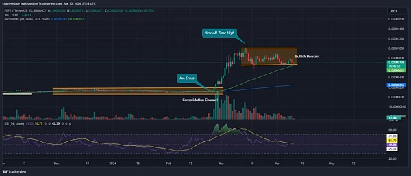 Pepe 目前的价格低于 0.00001064 美元的历史高点,但有一些积极迹象表明在看涨三角旗模式内反弹。这种模式表明佩佩的看涨趋势可能会持续。