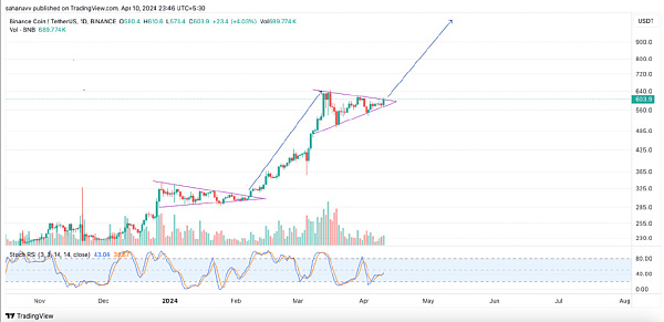 在突破决定性三角形后,BNB 价格引发了超过 100% 的健康上涨。现在价格似乎陷入了另一个决定性的三角形内,是时候恢复类似的突破了。此外,随机RSI也从低点反弹,这表明价格可能会保持健康的上升趋势并突破三角形。因此,当比特币减半后市场变得极度看涨时,价格也可能会上涨至 1000 美元。