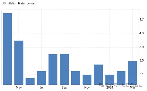 根据Trading Economics 4月10日的数据,衡量通胀的关键经济指标CPI在3月份上涨0.4%,推动年通胀率升至3.5%。值得注意的是,这超出了经济学家的预测,最重要的是,粉碎了美联储今年大幅降息的希望。