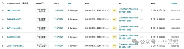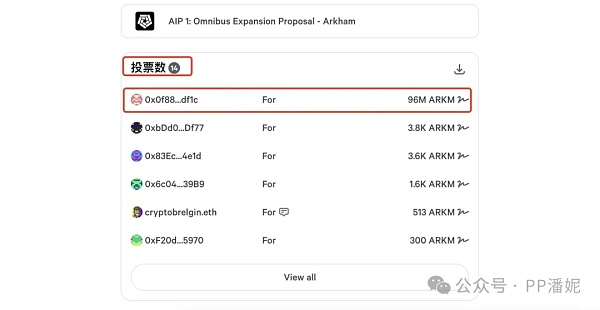 不过,有意思的是,本次投票仅有14个地址参与投票,其中投票数第一的地址占据了绝对的权利(第一名投票数为9600万枚ARKM,第二名投票数仅为3800枚ARKM)。投票数第一的地址(0x0f88开头)近几个月的合约记录均只与Arkham 项目相关合约交互并批准相关转账,可以推测应该是项目方控制的地址。简单来讲,Arkham 基金会自己给自己批准了一项预算。