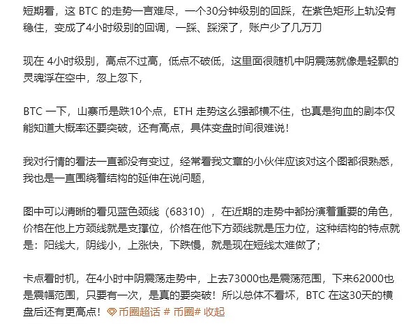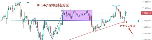 BTC 67800点止跌,短线适当波段抄底!BTC在4小时MA 250(67800)处成功反弹上涨,这一点位在昨天的解盘中早有预告。近期推荐的ENA、OAX、SFP均取得盈利,但整体市场仍处于中性震荡状态。技术分析难以准确预测向上突破的时间,因此在跌至支撑时适度加仓,在涨势完成后减仓保留舒适的仓位。真正的突破将伴随以下两个信号:BTC的日线均线系统(5/10/20)呈现多头排列。