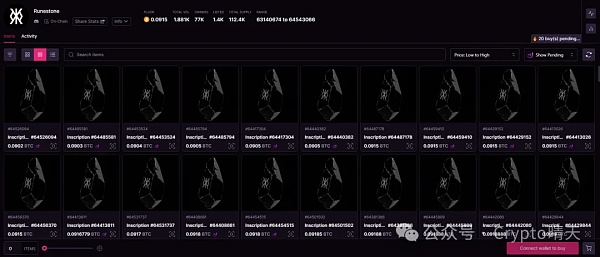 Runestone 是 Runes 协议上最早和最大的项目。受 Runes 协议即将启动以及空投预期,Runestone 地板价最近几日连续上涨,目前地板价达到 0.0923 BTC,市值达到 10340 BTC(约7.3亿美元)。