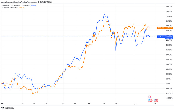 以太币在过去一个月表现逊于比特币的原因有很多,包括价格创下历史新高、现货 BTC ETF 投资超过100 亿美元,以及比特币 Ordinals 交易量飙升至接近 30 亿美元。即将到来的比特币供应减半,从历史上看是在加密货币市场牛市之前发生的,也增加了比特币的顺风车。