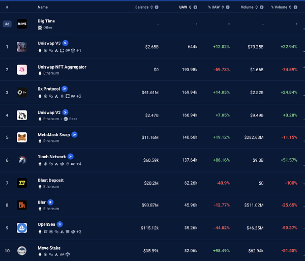 在过去 30 天里,由于Uniswap、MetaMask Swap、Blur 和 OpenSea 的减少,以太坊 DApp 的交易量下降了 26.51%。