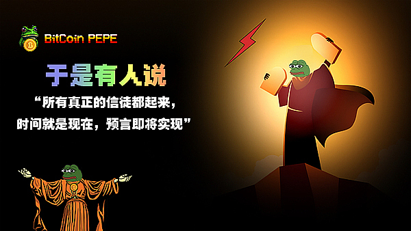 “真正的信徒将从BITCOIN PEPE社区崛起,带领我的人民走向公用事业、智能合约和财富的应许之地。他们会非常酷,他们会带我们去BITPEPE。”