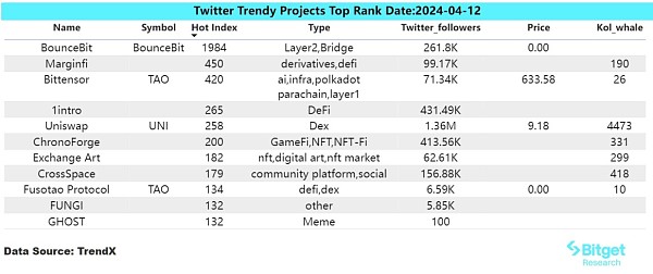 主要系 Binance 将于 2024 年 4 月 11 日 20: 00 (东八区时间)上线 Bittensor (TAO) 的公告引起推特及各社区的关注和讨论热度,先前随着人工智能(AI)在加密领域的热潮不断升温,Bittensor 网络注册子网的成本飙升至 670 万美元,AI 相关话题的社区讨论热度一直保持高位。
