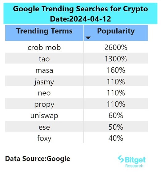 该地区区域热度呈现出较为分散的表现,其中 Floki、Crypto Bubbles、RWA 主要频繁出现在热搜上及在比特币减半行情的到来前,更多的散户会关注 Memecoin 和 RWA 等题材叙事。整体市场出现题材分化,在大盘处于较为稳定的情况下,开始进行板块题材的轮动炒作。