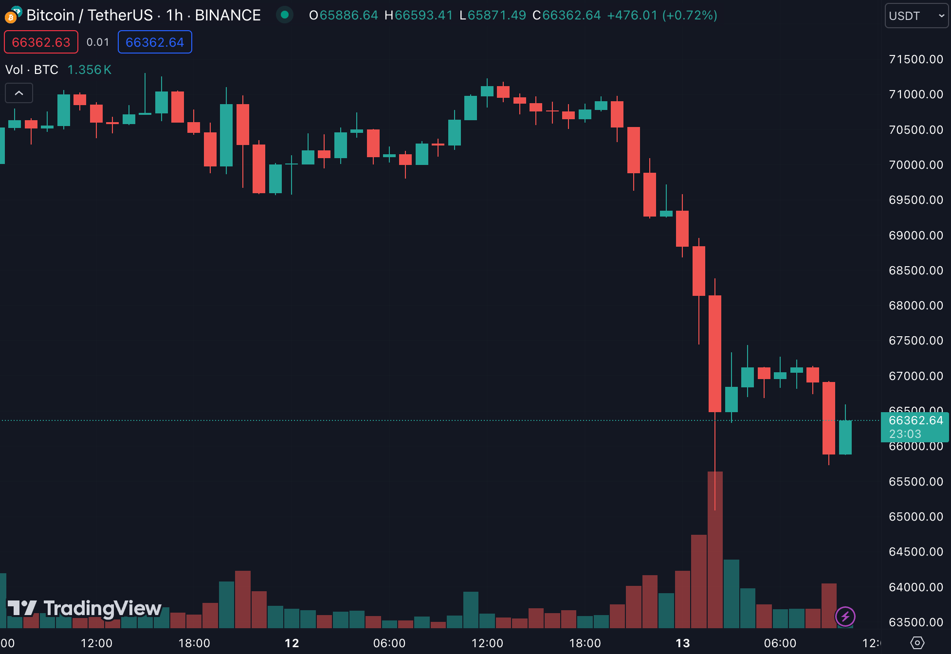 加密货币市场方面同样遭受波及,比特币在昨晚20:00 后卖压涌现,重挫8.3%、最低逼近65,086 美元,至截稿前持续在6.6 万美元区间震荡,暂报66,362 美元,近24 小时大跌近6%。