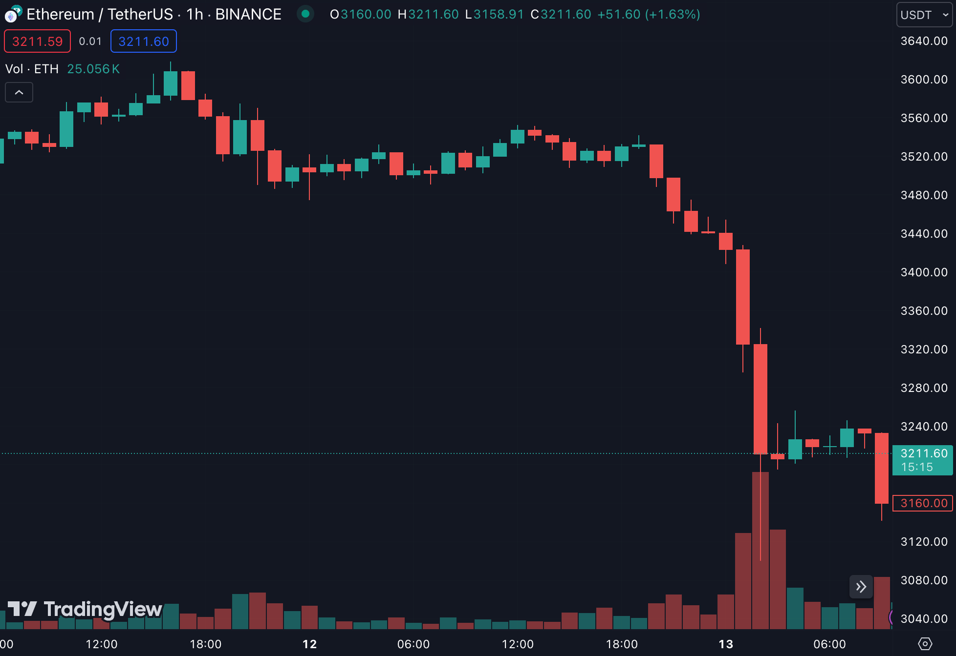以太坊跌幅更大,昨晚暴跌超12.2%,最低下杀3,100 美元,截稿前报3,211 美元,近24 小时跌幅高达9 %。