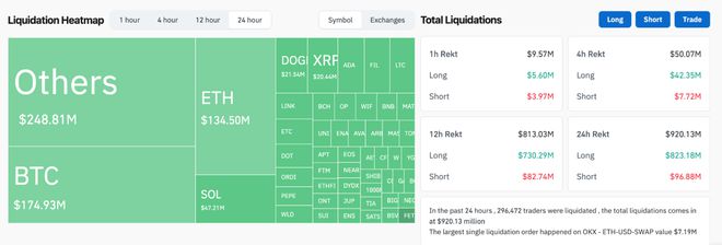 在比特币从近7 万水准插针6.5 万美元的状况下,据Coinglass数据显示,过去24 小时,加密货币全网爆仓金额超过9.2 亿美元,其中多单爆仓就高达8.2 亿美元,将近30 万人遭清算、灾情惨重。动区提醒读者,当前中东冲突使总体经济局势变得更加复杂,投资需谨慎小心。
