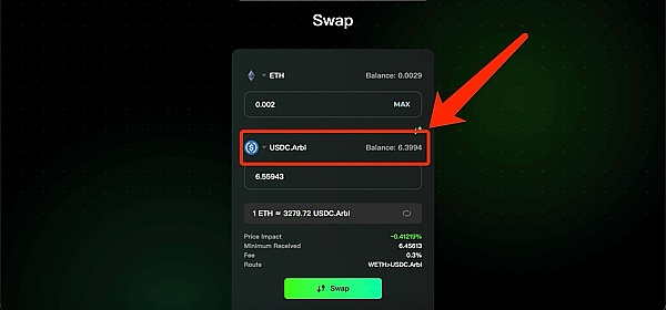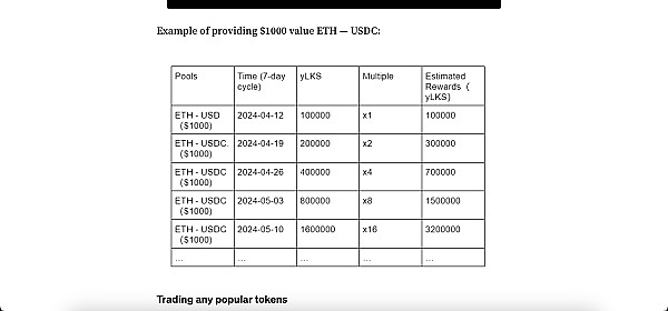 填写交互数量即可,建议是大于5USDT的操作,对于获取积分较为安全。点击Swap即可。注意交互的有效币种(USDC、USDT、WBTC、pufETH、WBTC、mswETH、wstETH、USDC、USDT、ARB、STONE、MANTA、WMNT。此外每交易量1 USDT奖励100 yLSK 例如,如果您将ETH(价值至少5USDT)兑换成USDC,您将立即收到100 yLKS。