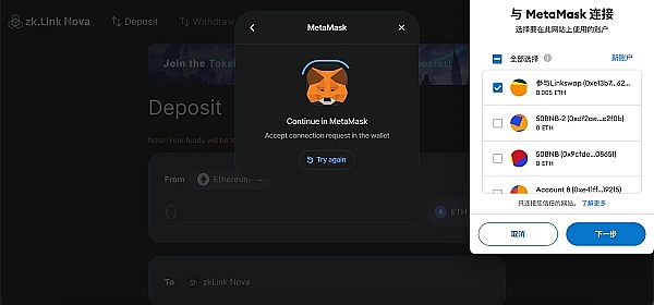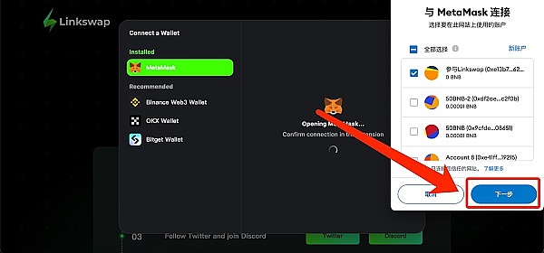 l 选择您使用的钱包进行链接,这里选择MetaMask进行展示,按图示进行即可