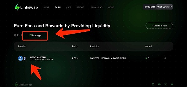 2、我们选择这个参与,点击Add Liquidity,输入您想参与的ETH数量,这里注意!一定要添加流动性总价值超过10USDT才有效。随后在Mange内可以看到您的添加流动性凭证。
