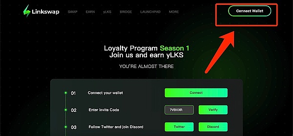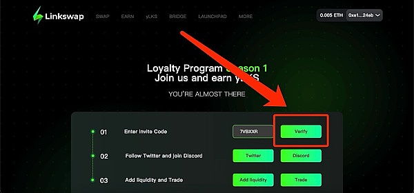 l 网络切换后,即可参与Linkswap的交互活动,第1步绑定并验证您的邀请码,点击Verify,登陆即可,随后即显示You are verifed