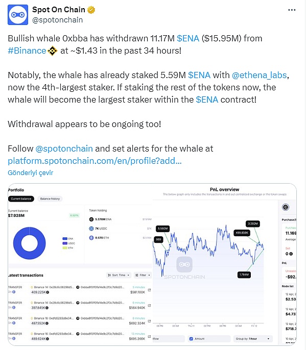 领先的加密货币托管平台Spot On Chain最近标记了钱包首字母“0xbba”标识的鲸鱼的重大举动。这只鲸鱼在过去 48 小时内通过多次交易从币安提取了惊人的 1117 万个 ENA 代币。截至撰写本文时,这些代币价值 1595 万美元。
