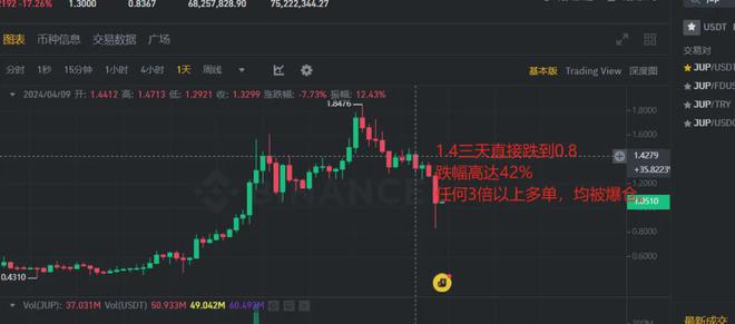 以个人比较看好的jup为例,我们都不用按照最高点计算,就以中轴位置1.4来计算,昨晚最低跌倒0.8附近,跌幅高达42%,任何高于3倍的合约单子,都会被爆仓,庄家昨晚收割的真是盆满钵满。