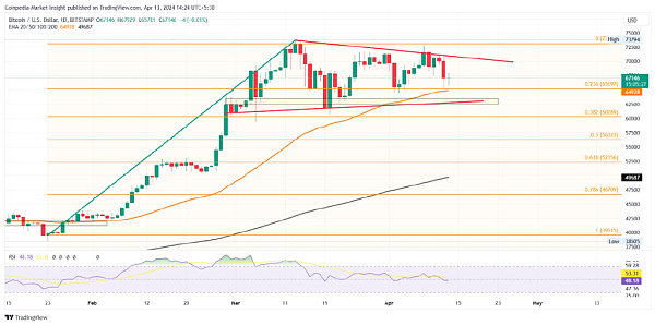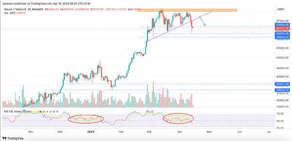 考虑到 RSI 走势,很明显,这次反弹正在重复之前的价格走势。此前,当 RSI 跌破盘整状态时,BTC 价格从 46,000 美元以上的当时高点大幅下跌,并在 38,600 美元左右形成低点。随着第三次突破 72,279 美元至 73,779 美元之间最终阻力区的尝试被拒绝,类似的交易模式似乎正在重复,这可能会加剧加密货币的抛售压力。 如果价格重复上一个周期,那么交易者可能会获得另一个以更折扣的价格积累BTC的机会。当时价格已跌破关键支撑位,因此代币跌破 60,000 美元并达到 58,808 美元左右关键支撑位的可能性更大。然而,全球紧张局势也导致了比特币的下跌,因此比特币可能会在几天内保持盘整。 然而,一旦 RSI 达到较低阈值并触发反弹,新的看涨行情就可能开始,将价格推向新高,可能高于 75,000 美元。