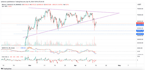 尽管市场情绪仍然看跌,但预测仍然看涨,特别是在较长的时间范围内。最近的回调可能看起来令人畏惧,但重要的是要认识到这种波动是比特币波动性的一部分,特别是在其持续的牛市轨迹和即将到来的减半期间。 BTC价格在前一日交易中出现三角形假突破,导致大幅下跌,引发多次止损。尽管如此,从宏观角度来看,看涨情绪仍然完好无损。