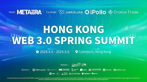 由 Meta Era、Web3Labs、iPollo 和 Cronos Trade 联合主办,AINN Layer2、CertiK、PSE Trading、Sensors Data、Neo、Gryphsis Academy、NuLink、Depin Dao、SWT、OSL、 Open Sand、zkLink、SphereX 赞助的「香港 Web 3.0 春季峰会」于 2024 年 4 月 4 号至 5 号在香港盛大召开并圆满落幕。