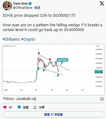 据著名加密货币分析师Trade Byte称,SHIB 价格下跌 52% 至 0.00002175 美元,但现在所有人的目光都集中在下降的楔形形态上。如果价格突破一定水平,可能会反弹至 0.0000456 美元,较当前的 0.00002353 美元价格大幅上涨。