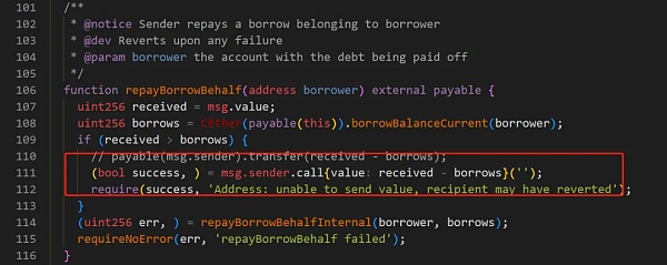 那么,漏洞其实就比较明显了。mint 、 borrow 、 redeem 、 repay这些操作均应该是原子操作。但是,repayBorrowBehalf出现了一个重入漏洞,攻击者通过构造一个特殊的金额( borrowsAmount + 1 wei )。sdrETH 将多余的1 wei重新发送给攻击者合约,从而触发了攻击合约2的fallback函数,在fallback函数中(在ETH转入时,exchangeRate 已经增长了1倍,攻击者手中的sdrToken的价值增加了一倍),攻击者进行重入攻击,调用借贷函数,借出了其他资产。最后,还清SumerMoney和Balancer的借贷,攻击完成。
