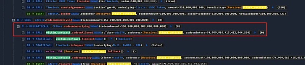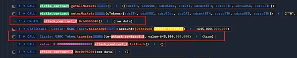 接着,在攻击合约2的攻击函数中,攻击者将645000 USDC通过mint 兑换为643630 sdrUSDC 。