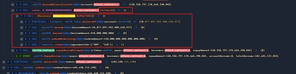 我们可以看到,合约会将超出总借款的部分再转回给用户。由于,sdrETH pool收到了150.358797170664290046 ETH ,但是只借出了150.358797170664290045 ETH ,所以会将0.000000000000000001 ETH再转给攻击合约2。由于接到了ETH转账,攻击合约2触发了fallback函数,fallback函数中又调用了攻击合约1,再次进行borrow 和redeemUnderlying 。