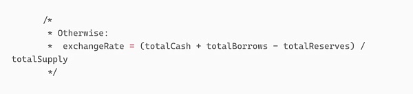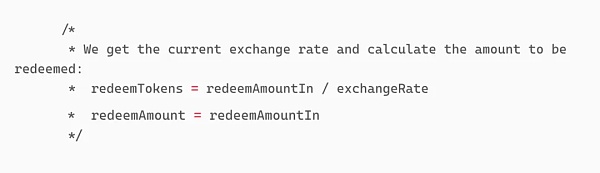 由上面的公式,我们可以知道兑换的underlying token为对应的sdr token除以exchangRate 。由下面的公式同样可以知道exchangeRate的计算方式。