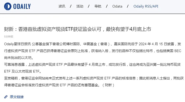 4 月 15 日,华夏基金(香港)获得香港证监会批准,可向投资者提供虚拟资产管理服务,现计划发行能够投资于比特币现货和以太坊现货的 ETF 产品。