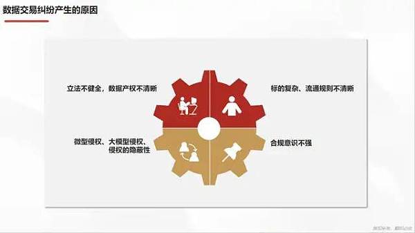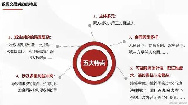 数据交易纠纷包括主体多元、合同类型多样等特点。在纠纷场景中,我们发现,数据合规在很多的业务场景中,需要将IPO、并购、投融资等作为一个单独的合规模块去考虑。同时,数据交易涉及到利益冲突非常多,包括人格权、财产权,不同企业财产权,众多利益混合在一起,数据的产权归属及划分问题到底该怎么做,这是未来法律要做出的回应。