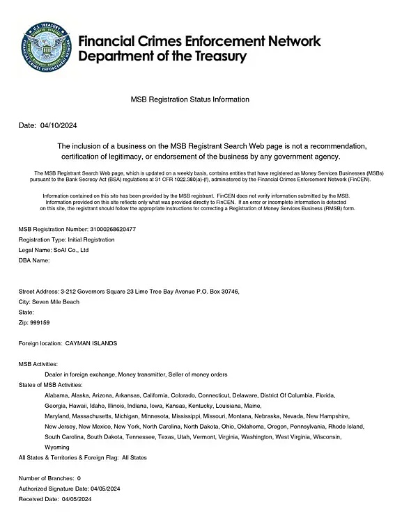 近日,SOAI(SoAI Co., Ltd)平台宣布获得美国FinCEN颁发的MSB(货币服务业务)牌照!此消息引起了全球加密货币行业的广泛关注,标志着国际市场对SOAI合规性和专业性的进一步认可。