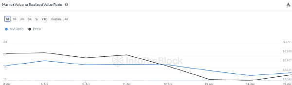 根据 IntoTheBlock 数据,ETH 价格的 MVRV 比率(市场价值与实现价值)有所下降,目前为 1.69。这表明以太坊的市场价值正在接近其实现价值,或最后一笔交易的价值。这是在交易员通过以峰值出售所持股份来获利后触发的。结果,这削弱了当前的购买信心。