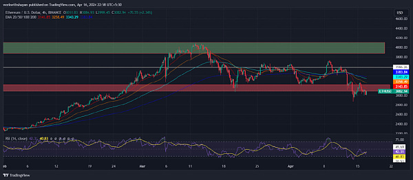 以太坊价格在 3,300 美元关口面临巨大的看跌压力。结果,价格再次下跌并跌破EMA20趋势线。然而,多头的目标是通过将价格维持在 3000 美元的心理水平之上来捍卫进一步的下跌。截至撰写本文时,ETH 价格交易价格为 3,057 美元,在过去 24 小时内下跌超过 4.9%。