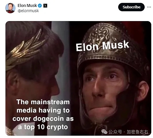 马斯克写道:“主流媒体不得不将狗狗币列为10大加密货币。”
