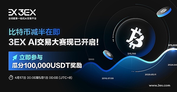 随着2024年4月20日BTC第四次减半的日益临近,整个加密货币市场都充满了期待和热情。在这一重要时刻,3EX AI交易平台特别推出了一系列富有吸引力的专题活动,并在此前进行了AI交易功能的重要升级,以鼓励用户通过3EX平台最前沿的一站式AI交易功能享受到市场的繁荣和AI交易的红利。