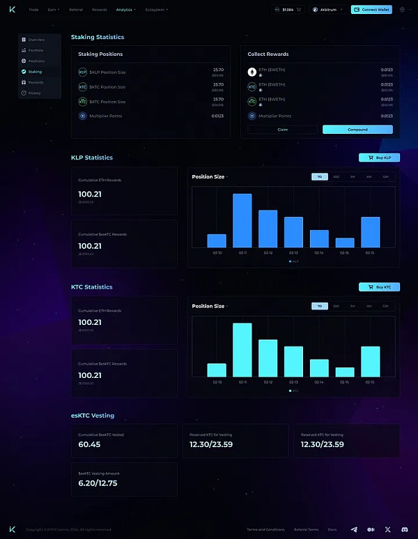 关于质押的详细统计数据,包括质押的 KTC 和 KLP,已获得的和解锁的 esKTC 数据。